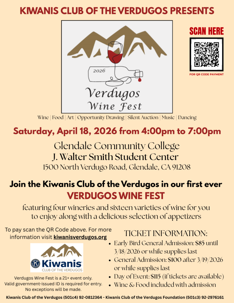 🎉 Excitement is in the air! Join the Kiwanis Club of the Verdugos for an extraordinary wine-tasting journey. Savor a curated selection of wines from Paso Robles and Santa Barbara to Spain and Italy, all perfectly paired with thoughtful selection of appetizers (including vegan options) prepared by GCC Culinary Arts.🎉